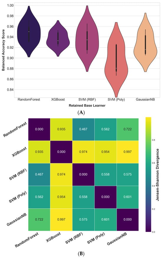 Complementarity assessment of the retained base learners. (A) Distribution of 5-fold cross-validation BA scores, used to assess the diversity in the models’ learning behaviors via the Friedman test. (B) Pairwise JSD between model outputs, quantifying probabilistic diversity.