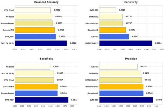 A wide variety of algorithms have been employed as meta-learners in stacking ensembles, ranging from single classifiers such as Decision Tree, Naïve Bayes, and SVM [,,,,,], to more complex ensemble-based systems including RF, XGBoost, and LightGBM [,]. Multi-Layer Perceptrons (MLPs) are also frequently adopted as meta-learners [,,] and have been reported to outperform alternative choices in clinical prediction contexts [,]. This diversity in the literature indicates that there is no single “golden standard” meta-learner, and the most appropriate choice depends on the data structure and problem setting []. Within the DAPLEX framework, the MLP was deliberately selected as the meta-learner due to its distinct advantages in addressing the specific challenges of the application. First, the complex, non-linear relationships inherent in clinical diagnostic data often constrain the predictive capacity of simpler, linear models. An MLP, with its inherent ability to capture such intricate patterns, was therefore regarded as a more suitable candidate. Second, the MLP architecture is particularly well-suited to process the unique, hybrid meta-input of the framework, which combines probabilistic outputs from base learners with raw, high-importance feature values. This capacity to effectively integrate and uncover complex relationships within heterogeneous sources of information establishes the MLP as a technically robust choice for the complementarity-driven knowledge fusion central to DAPLEX.
