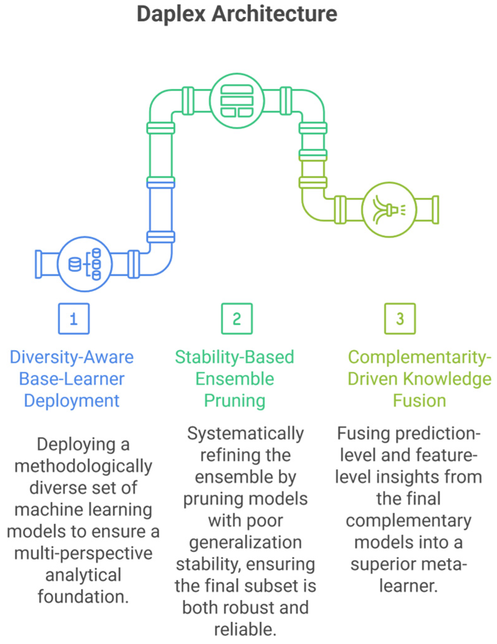 The success of the DAPLEX framework is attributable to its structured three-phase architecture, which systematically addresses key challenges in ensemble modeling through interdependent stages. Phase I established a rich predictive foundation by deploying a heterogeneous set of base learners from distinct algorithmic paradigms, thereby ensuring diversity as the prerequisite for later fusion. Phase II built directly on this foundation, acting as a critical quality-control gate where generalization stability was used to prune unreliable models such as KNN, thus safeguarding the integrity of inputs to the fusion stage. Finally, Phase III operationalized the core novelty of the framework: a complementarity-driven knowledge fusion that would not have been feasible without the heterogeneity created in Phase I or the reliability enforced in Phase II. By integrating not only the models’ predictive outputs but also their underlying feature-level insights, Phase III enabled the final meta-learner to operate on a richer and more trustworthy diagnostic representation than is available in conventional stacking approaches.