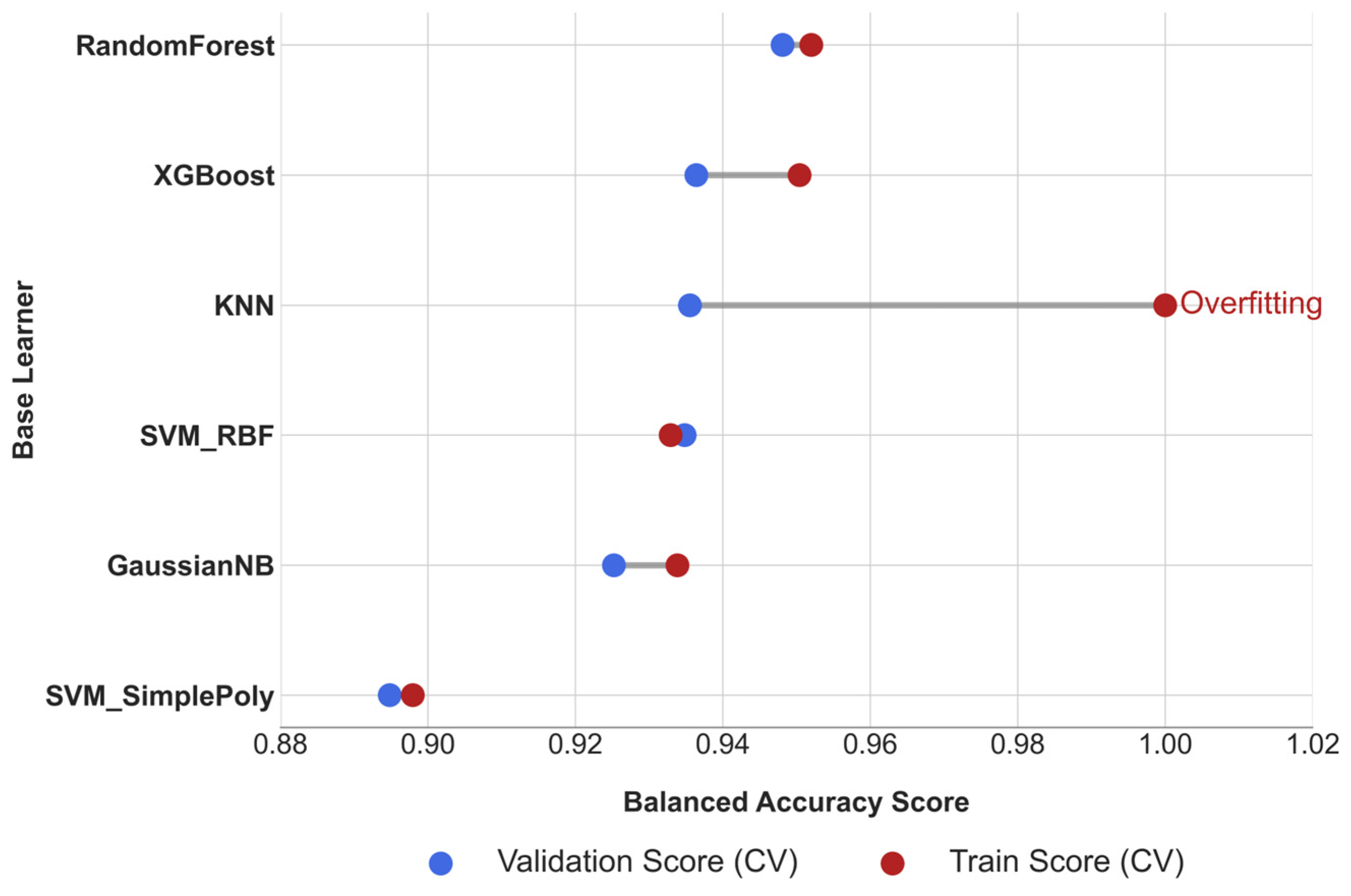 Phase II: Stability-Based Ensemble Pruning: A rigorous pruning procedure, based on 5-fold cross-validation results from the training data, was employed to retain only those learners exhibiting both high performance on the validation folds and robust generalization stability, quantified as a minimal gap between training and validation scores.