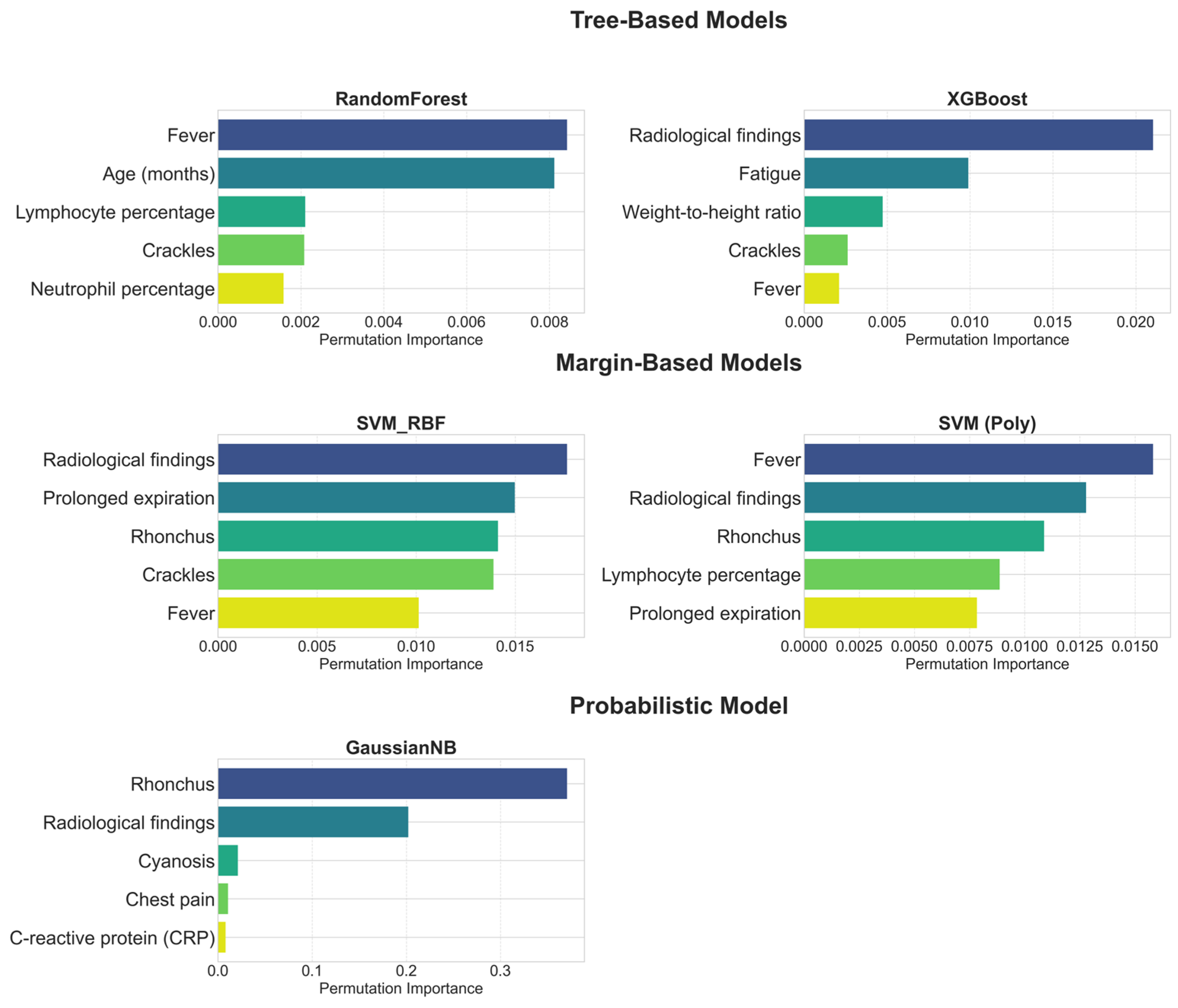 A key finding from the knowledge fusion phase was the consensus-based ranking of predictor importance, which aligns closely with established clinical pathophysiology. The top five predictors identified by the Borda count “Radiological findings”, “Rhonchus”, “Fever”, “Prolonged expiration”, and “CRP” span multiple clinical domains and reflect a holistic diagnostic signature. The high ranking of “Radiological findings” and “CRP” is consistent with literature that identifies them as strong indicators of the parenchymal inflammation characteristic of pneumonia [