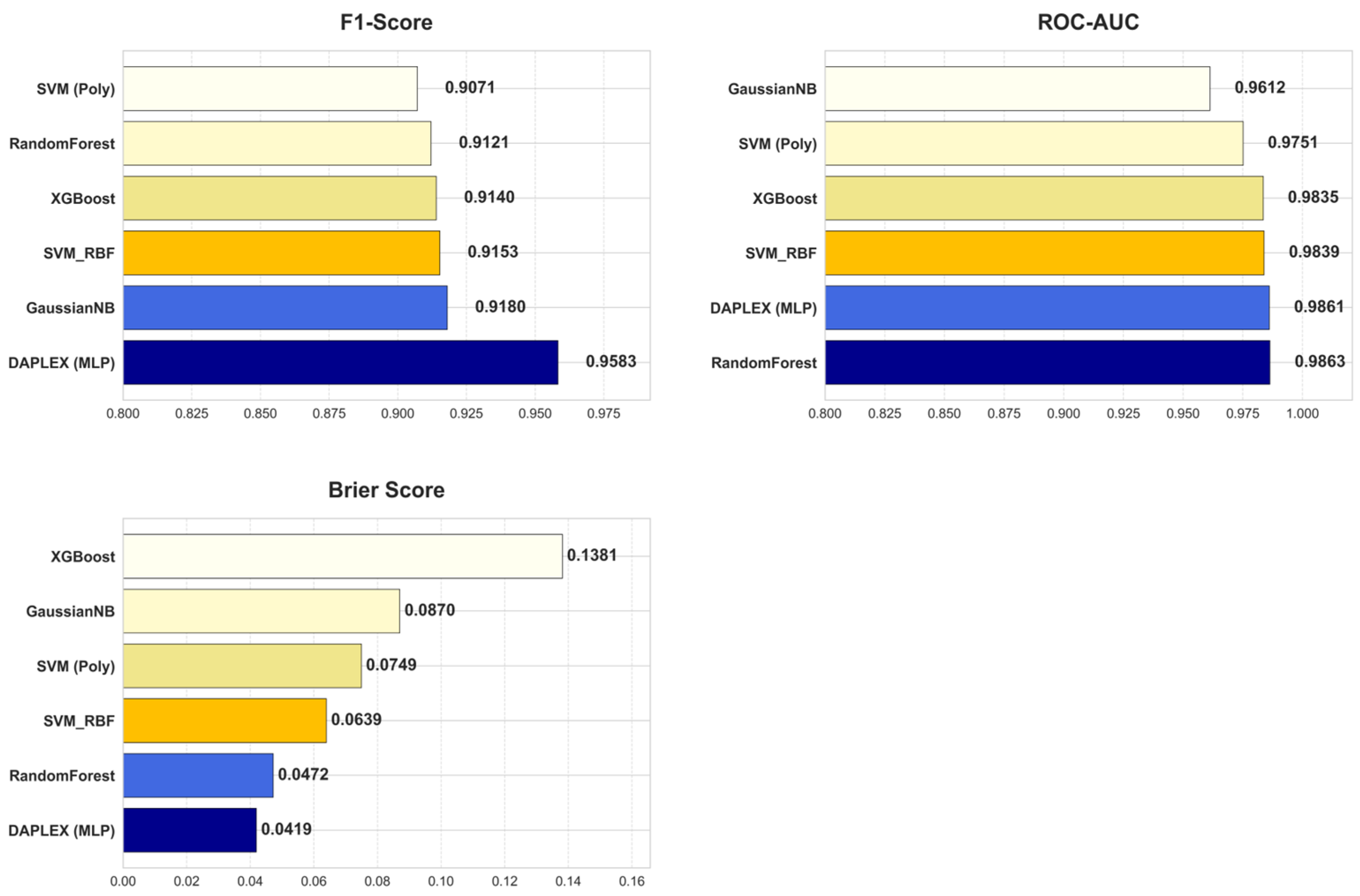 21]. However, these studies seldom provide a systematic process for constructing ensembles based on both diversity and complementarity, and almost none integrate probability-level outputs with feature-level insights in a unified architecture. In contrast, DAPLEX explicitly operationalizes this dual perspective by combining prediction-level outputs with a consensus ranking of feature importance profiles, thereby linking performance with interpretability in a single, unified workflow.