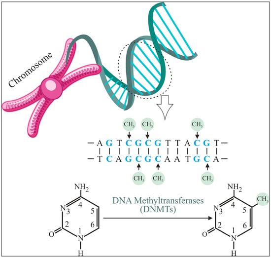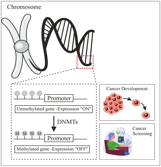 Deoxyribonucleic Acid (DNA) methylation is a biochemical process that regulates many genes. It is a key epigenetic mark implicated in cell fate regulator silencing during normal growth and disease development. DNA methylation plays a crucial role in controlling X-chromosome inactivation, genomic imprinting, and gene expression in animals. As shown in Figure 1, this mechanism involves the addition of a methyl group at the fifth carbon of a Cytosine within Cytosine–Phospho–Guanine (CpG) dinucleotides, catalyzed by DNA Methyltransferases (DNMTs). DNA methylation patterns are intricately linked to cellular memory, lineage determination, and chromatin structure regulation [1]. Aberrations in these patterns, including promoter hypermethylation and global hypomethylation, have been associated with numerous diseases, including cancer, where these modifications play a pivotal role in tumorigenesis and genomic instability [2,3].