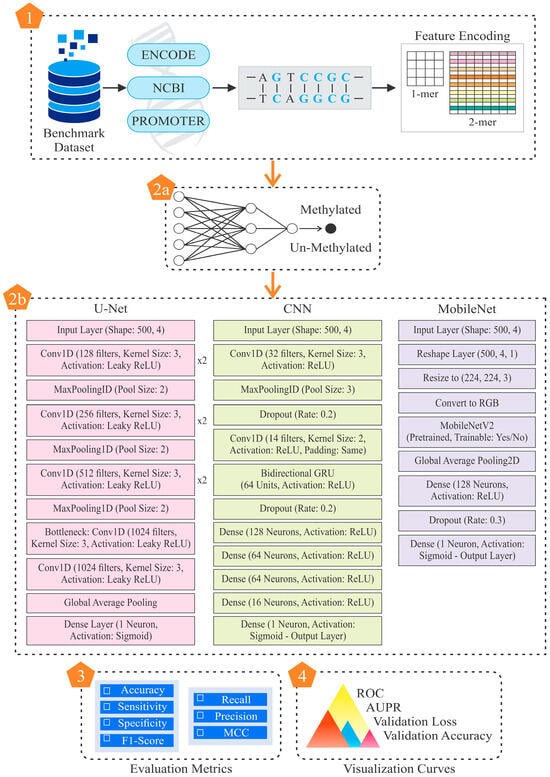 The existing methods are often standalone models that operate in a single domain, whereas hybrid systems operate in many domains and are capable of performing the classification process more efficiently. However, they are not commonly used in research on cervical cancer diagnosis. Thus, further research on DL-based computational diagnostic systems is required, since parameters related to CG methylation need to be quantitatively reliable in a number of sequential patterns. The proposed study highlights the importance of feature extraction, which may lead to understanding cervical cancer’s association with the underlying DNA pattern. The previous models, although quite useful, have shown opportunities for additional optimization regarding sensitivity, specificity, and overall accuracy. Thus, the current work is a modest attempt to improve upon the limitations of existing models. Figure 2 describes the comprehensive workflow of this study.