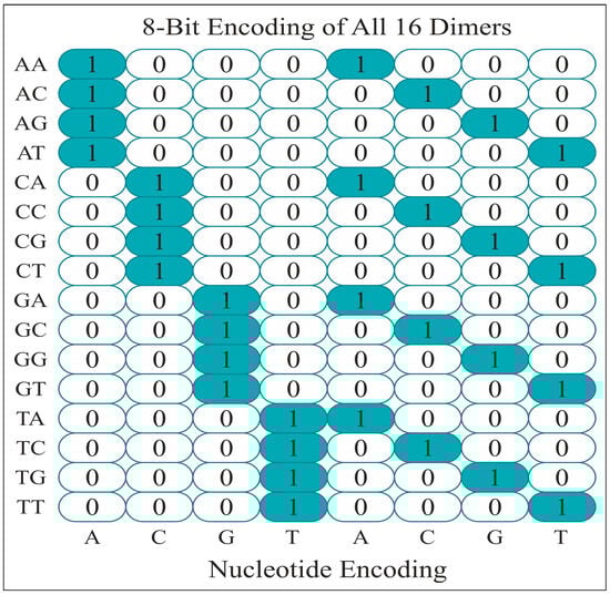 Similarly, the principle mentioned above was utilized to encode these DNA bases as dinucleotides, which gave 16 indices for 16 combinations of dinucleotides. A DNA sequence of 300 bp may be transformed into a 5000 × 300 × 4 vector through monomer encoding, with each column denoting a nucleotide and each row representing a feature. Similarly, the matrix dimensions with an equivalent window size for dimer encoding would be 5000 × 299 × 8. Figure 3 displays the 8-bit dimer encoding representation for all the 16 dinucleotides.
