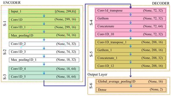 Decoder Block (Up-sampling Path): The decoder reconstructs the sequence length through Conv1DTranspose layers, integrating encoder features through skip connections to recover fine-grained details. At each stage, the sequence length expands , while the number of filters decreases . This progressive up-sampling restores the resolution of the sequence while retaining the hierarchical context learned in the encoder.