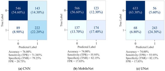 It can be observed from Figure 6a that the CNN model attained an overall ACC of 76.80%, with SP (TNR) of 79.25% and SN (TPR) of 71.38%. While CNN demonstrated a reasonably balanced performance, it exhibited a tendency to misclassify positive cases, as reflected in the greater number of FN. In comparison, MobileNet recorded a slightly lower ACC of 74.00%. Its specificity improved to 82.15%, thereby reducing the FPR to 17.85%, but this improvement came with lower SN, which dropped to 55.95%. This indicates that MobileNet was more conservative in predicting positive cases, leading to a considerable increase in missed detections (FN = 137). On the other hand, UNet demonstrated better performance across all the evaluation metrics with an ACC of 87.60%, SN of 78.14%, and SP of 91.87%. Notably, its FPR was the lowest at 8.13%, while simultaneously reducing FN to 68, thereby achieving a better trade-off between positive and negative classification. These results highlight that UNet outperformed both by maintaining high SP and substantially improving SN, making it the most robust model for reliable classification in this dataset.