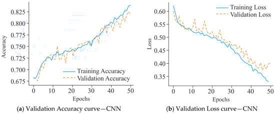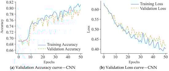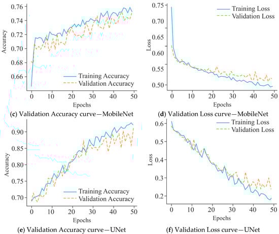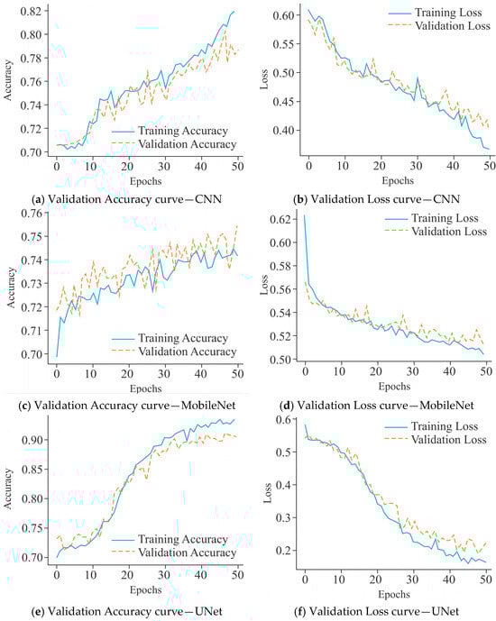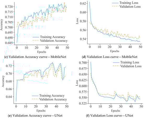 The VA curves for the CNN model, as shown in Figure 13a, demonstrated a constant upward trajectory, with training accuracy of 82% and validation accuracy stabilizing around 77% after 50 epochs. Although a small gap existed between training and validation accuracy, the fluctuations remained moderate, suggesting limited overfitting and acceptable generalization performance. In comparison, the performance of MobileNet (Figure 13c) was not as good as that of the CNN model. Its training accuracy was about 72%, while validation accuracy fluctuated heavily around 70–71%, occasionally dipping lower. The instability of the validation curve reduced the generalization of the model and indicated a stronger tendency toward overfitting despite lower training accuracy. On the other hand, UNet (Figure 13e) maintained a relatively better alignment between training and validation accuracy, both stabilizing around 71–72%. Although fluctuations were visible, they remained less pronounced compared to MobileNet, reflecting its greater generalization. Overall, these findings reflect that CNN outperformed MobileNet and UNet models in terms of accuracy stability, while UNet maintained a comparatively balanced generalization profile, making it more reliable than MobileNet under the same experimental conditions.