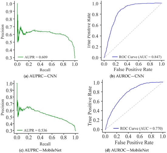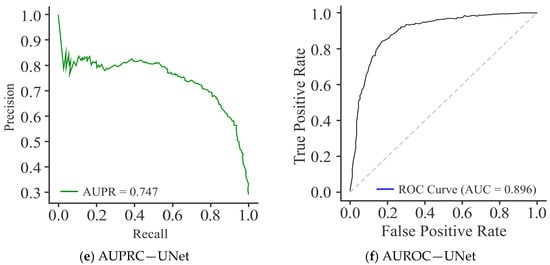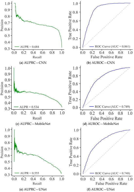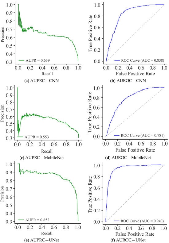 The PR curves for the CNN model, as shown in Figure 11a, achieved an AUPRC score of 0.609, reflecting moderate performance. However, precision dropped sharply at higher recall values, indicating that CNN struggled to maintain consistent precision across thresholds. The performance of MobileNet (Figure 11c) was not as good as that of the CNN model, with the lowest AUPRC of 0.536, and consistently reduced precision across the recall spectrum, highlighting its limited discriminative ability and poor balance between precision and recall. In comparison, UNet (Figure 11e) demonstrated a clear advantage by achieving the highest AUPRC of 0.746. Its curve remained relatively smooth, with precision values consistently higher over a broad recall range, especially in the mid-to-high recall regions. This stability indicates that UNet established a better trade-off between precision and recall than CNN and MobileNet.