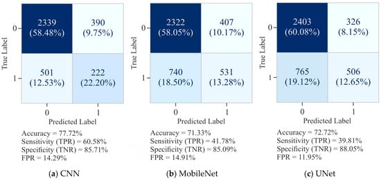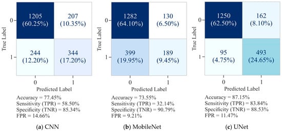 The confusion matrix for CNN, as shown in Figure 9a, registered an overall ACC of 77.45%, with SP (TNR) of 85.34% and SN (TPR) of 58.50%. This shows that CNN was effective in minimizing FP (FPR = 14.66%), but its relatively low SN suggests difficulty in identifying positive cases, as evidenced by a higher proportion of FN, being 244. In comparison, MobileNet, as presented in Figure 9b, recorded a slightly lower ACC of 73.55%. While its SP increased to 90.79% with a reduced FPR of 9.21%, its SN dropped to 32.14%, reflecting substantial misclassification of positive instances (FN = 399). This result suggests that the performance of MobileNet was as good as that of CNN in detecting TP. On the other hand, UNet, as depicted in Figure 9c, clearly outperformed both CNN and MobileNet by maintaining the optimal balance between SN and SP. It recorded an ACC of 87.15%, with SN of 83.84% and SP of 88.53%, alongside a comparatively low FPR of 11.47%. UNet’s ability to minimize FP to 162 and FN to 95 demonstrates its robustness in effectively capturing accurate signals while avoiding overprediction of positives.