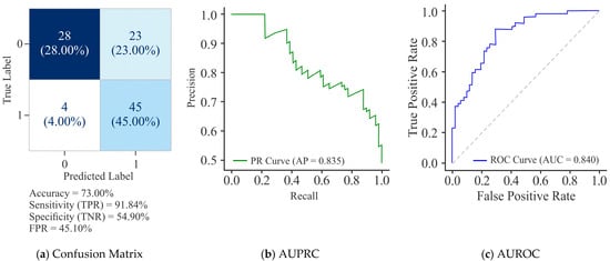 The confusion matrix was used to calculate several standard evaluation metrics, including Sensitivity (SN), Specificity (SP), Accuracy (ACC), Matthews Correlation Coefficient (MCC), F-1 score, Area Under the Receiver Operating Characteristic (AUROC) Curve, and Area Under the Precision–Recall Curve (AUPRC) [19]. The following are the formulae for these metrics: