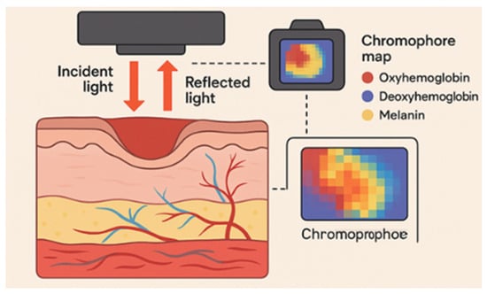 Near-infrared (NIR) spectroscopy imaging, illustration of the mechanism of action in wound assessment. Reflected light from hemoglobin, deoxy-hemoglobin, and melanin is filtered and analyzed to create anatomical tissue maps, aiding in the classification of wound depth and oxygenation levels for prognosis evaluation.