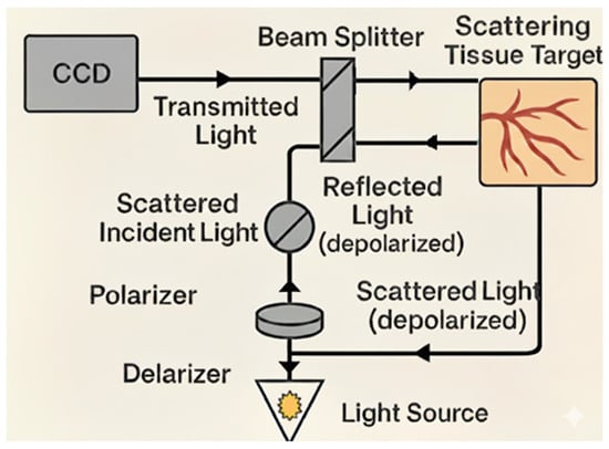 Orthogonal Polarization Spectral Imaging, illustration of the mechanism of action for burn depth classification. Polarized light at a specific wavelength is projected onto the tissue, penetrating deeply before becoming depolarized. An orthogonal polarizer eliminates unwanted reflections, allowing only deeply penetrating light to be captured by a charged coupled device (CCD) camera.