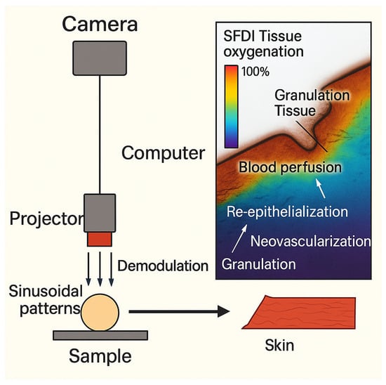 Spatial Frequency Domain Imaging (SFDI) for Wound Assessment. The SFDI setup used to project sinusoidal patterns onto a sample and acquire images. The resulting SFDI tissue oxygenation and blood perfusion map highlights various stages of wound healing.