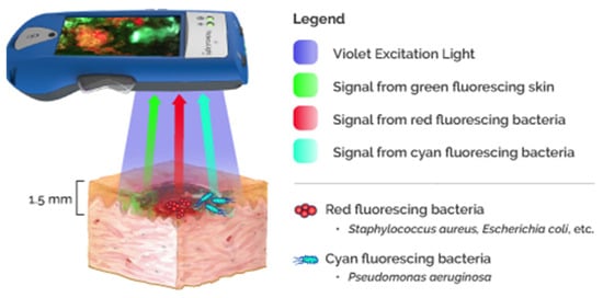 Fluorescence Imaging (FI) leverages endogenous bacterial components found within bacterial species. The basic approach of the FI technique is to shine a safe 405 nm violet light to excite fluorophores in and around the wound up to a penetration depth of 1.5 mm [63]. Some fluorophores are specific to certain bacterial species; for instance, pyoverdine is an endogenous virulence factor of Pseudomonas, which enables the emission of a cyan fluorescent signal (REF) [64,65], and porphyrins are a byproduct of the heme pathway found in most bacterial species, which emit a red fluorescent signal visible under the violet light (REF) [65]. Other fluorescence imaging techniques require the use of exogenous fluorophores (“contrast agents”), which involve dye injection and subsequent assessment by non-invasive imaging techniques to assess vascular sufficiency and tissue perfusion [66]. These exogenous fluorescence techniques are considered impractical in some wound care settings; furthermore, the safety of these materials is still questionable in pediatrics and in pregnant or nursing women [67,68]. In contrast, the fluorescence imaging device (MolecuLight i:X, D:X, Toronto, ON, Canada) is safe and contact-free and captures fluorescent signals when bacterial concentrations are found at or surpass the 104 CFU/gr of tissue threshold (REF) [69]. A specialized optical filter allows only the transmission of relevant fluorescence signals, maximizing their intensity by removing potential “noise”. The accuracy of these signals in the detection of moderate to high bacterial loads reported in literature ranges between 93% and 100% depending on the signals detected. The highest accuracy has been found with the cyan signal, which is specific for Pseudomonas aeruginosa (REF); however, the red signal can be emitted from other tissue components, such as necrotic cells or inflammatory infiltrates, resulting in false positives and reduced signal specificity [65,69,70]. It has been established in the literature that the MolecuLight® bacterial fluorescence imaging device is a helpful tool to detect bacterial presence in real-time (at the bedside) and also enables targeted swabs and debridement [71,72,73,74,75]. The outcome-predicting capabilities of these signals have been proven, as positive bacterial fluorescence is directly linked to poor healing in chronic wounds, increased risk of infection and its complications, and the failure of CTPs (cellular tissue products, “skin substitutes”) (REFs) [76,77,78,79]. Figure 4 demonstrates the principle of MolecuLight® action [13].