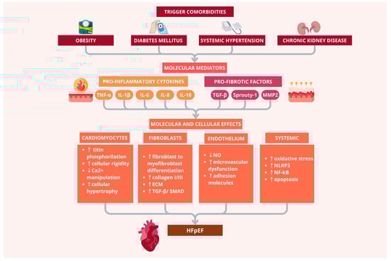 Complex inflammatory and profibrotic pathways contributing to HFpEF development. Triggering comorbidities such as obesity, diabetes mellitus, systemic hypertension, and chronic kidney disease activate molecular mediators, including pro-inflammatory cytokines: tumor necrosis factor α (TNF-α), interleukin 1β (IL-1β), interleukin 6 (IL-6), interleukin 8 (IL-8), interleukin 18 (IL-18) and pro-fibrotic factors: transforming growth factor β (TGF-β), Sprouty-1 and matrix metalloproteinase 2 (MMP2). These mediators cause molecular and cellular effects in cardiomyocytes, fibroblasts, endothelium, and systemic tissues, resulting in increased stiffness, fibrosis, inflammation, and oxidative stress. Collectively, these changes contribute to HFpEF onset.