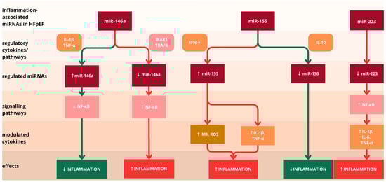 miR-223 is predominantly expressed in cardiomyocytes and functions as a negative regulator of neutrophil activation and chemotactic responses [34,43]. It is highly expressed during granulocyte differentiation, and while not required for granulocyte differentiation, it is critically essential for proper granulocyte maturation [44,45]. Its downregulation promotes IL-1β and IL-6 production and determines further enhancement of NF-κB activation, supplementary increasing IL-6 and TNF-α expression and thereby contributing to systemic and myocardial inflammation, central features of HFpEF (Figure 2) [46]. Despite the complex and multifaceted roles of miR-223 in myocardial inflammation, there is considerable interest in investigating its dual function concerning its clinical significance in HF. According to Liu et al., miR-223 primarily contributes to adverse cardiac remodeling and progression to HF after myocardial infarction by enhancing fibrotic signaling, but clinical research regarding the implications of miR-223 in specifically HFpEF is limited [47]. The regulatory functions of miR-146, miR-155, and miR-223 are illustrated in Figure 2.
