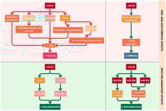 In addition to its established role in regulating fibrosis, miR-29a also plays a key role in modulating inflammation. An experimental in vitro study revealed that miR-29a exerts an anti-inflammatory effect by directly targeting the LPL gene, leading to suppression of pro-inflammatory cytokine production, notably decreasing IL-6 and TNF-α secretion [73]. miR-29b and miR-29c act as negative regulators in dendritic cell survival by promoting plasmacytoid dendritic cell apoptosis (Figure 3) [74]. Although primarily a hepatocyte-specific miRNA, miRNA-122 has been proved to exert a dual role by modulating both myocardial inflammation—through its involvement in autophagy, apoptosis, oxidative stress, and hypertrophic signaling pathways—and cardiac fibrosis—via attenuation of TGF-β1 signaling, suppression of MMP2 expression, and promotion of pro-fibrotic remodeling in diabetic cardiomyopathy and aortic valve stenosis [75]. The paradoxical roles of miR-21 and miR-29 in cardiac remodeling are presented in Figure 3.
