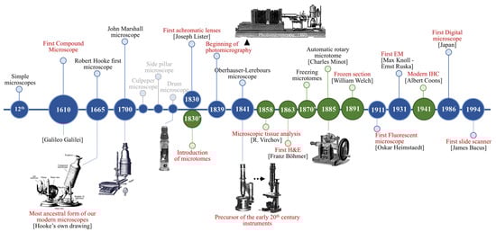 Galileo Galilei is widely credited for inventing the first compound microscope in 1610 by experimenting with telescope lenses, although Dutch spectacle makers, Hans and Zacharias Janssen, had reportedly used telescope lenses to enlarge small objects as early as 1590 [1,4]. Galileo’s compound microscope, called “occhialino”, represented a reduced form of the Janssens’ telescope and inspired further optical advancements. One notable innovation was Cornelius Drebbel’s powerful microscope in 1621, which surpassed the capabilities of Galileo’s occhialino and marked a significant step forward in the evolution of microscopy [5]. Robert Hooke’s microscope (1665), John Marshall’s design (1700), and the Oberhauser–Lerebours microscope (1841), among other innovations in microscopy, contributed to the development of modern compound microscopes, enabling the study of cells and tissues at the microscopic scale (Figure 1) [2,6,7,8]. While microscopes transformed visualization, the advancement of pathology required additional breakthroughs in complementary tools and techniques. The introduction of the microtome in the 1830s enabled precise and reproducible tissue sectioning, and freezing microtomes in the 1870s facilitated the development of the frozen sections technique, which is still critical today for rapid intraoperative diagnosis [9,10]. Paraffin embedding, introduced by Edward Klebs in 1869, and formalin fixation by Ferdinand Blum in 1893 further improved and standardized tissue processing. Meanwhile, histological staining methods such as Franz Böhm’s hematoxylin staining in 1865 marked a pivotal moment, creating a method that remains a cornerstone of today’s histopathology [11,12] (Figure 1). Undoubtedly, hematoxylin and eosin (H&E) staining remains a diagnostic gold standard for its clarity, cost-efficiency, and wide applicability. A major leap occurred in 1941, when Albert Coons et al. developed immunofluorescence using fluorescein isothiocyanate-labeled antibodies [13,14]. Despite its utility in research, it was less suited for routine surgical pathology due to its reliance on fresh tissue, the need for fluorescent microscopes, and fluorescence fading. In the 1960s, enzyme-labeled antibodies enabled durable, visible staining suitable for routine diagnostics, laying the foundation for immunohistochemistry (IHC) [15]. IHC has since revolutionized diagnostics by allowing targeted antigen localization in tissues, complementing H&E in tackling complex diagnostic challenges [14,16,17]. The development of photomicrography in the mid-19th century, allowing microscopic images to be captured and studied, further solidified the role of microscopy in pathology [18,19].