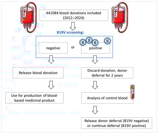 - Schmidt, M.; Themann, A.; Drexler, C.; Bayer, M.; Lanzer, G.; Menichetti, E.; Lechner, S.; Wessin, D.; Prokoph, B.; Allain, J.; et al. Blood donor screening for parvovirus B19 in Germany and Austria. Transfusion 2007, 47, 1775–1782. [Google Scholar] [CrossRef]