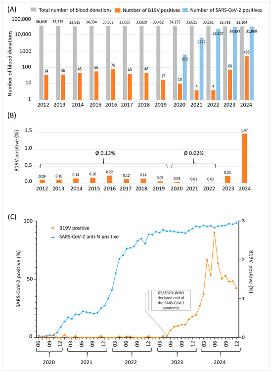 B19V epidemic dynamics in Salzburg, Austria between 2012 and 2024. (A) Data shown are total numbers of blood donations (grey), numbers of parvovirus B19 positive blood donations (orange) and numbers of SARS-CoV-2 total anti-N positive donations (blue) per year. A logarithmic scale was chosen to increase visibility of B19V-positive donations. In sum, 441,084 blood donor samples were included. (B) B19V prevalence rate per year between 2012 and 2024. (C) SARS-CoV-2 (blue, left y-axis) and B19V (orange, right y-axis) prevalence rates among blood donors given in percent between June 2020 and December 2024. The rate of B19V positivity increased significantly after the WHO declared an end to the public health emergency of international concern in May 2023.