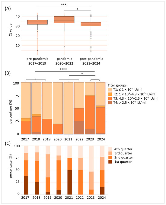As a next step, we analyzed the B19V prevalence before and after the SARS-CoV-2 pandemic in more detail, taking into account Ct-values and titers. We therefore defined comparable periods as pre-pandemic (2017–2019), pandemic (2020–2022) and post-pandemic (2023–2024). Our analysis revealed significantly decreased Ct-values in the post-pandemic phase when compared to both pre-pandemic (p < 0.001) and pandemic (p < 0.05) times (Figure 3A). As shown in Figure 3B, while during the pre-pandemic period and the first two years of the pandemic, up to 30% of B19V-positive donations revealed B19V titers within the third (4.3 × 103–2.5 × 106 IU/mL) or fourth (>2.5 × 106 IU/mL) titer group, B19V virus titers substantially increased in 2022 (50% in titer group 3 or 4). A further increase was even observed in 2023 (>70% in titer group 3 or 4), before titers began to fall again in 2024 (>50% in titer group 3 or 4). As already shown for Ct values, pairwise comparisons revealed significant differences for B19V titers: Post-pandemic titers were significantly higher compared to pre-pandemic (p < 0.0001) and pandemic (p < 0.05) values. We also investigated in which part of the year the B19V cases occurred (Figure 3C). Our data reveal that in the pre-pandemic phase (2017–2019), the majority of B19V-positive cases occurred in the second and third quarter of a year. Up to 75% of the few B19V-positive donations observed during the pandemic period were found in the first and second quarters. In the post-pandemic year 2023, 90% of all cases were in the third or fourth quarter. In 2024, B19V-positive cases were detected throughout the year.
