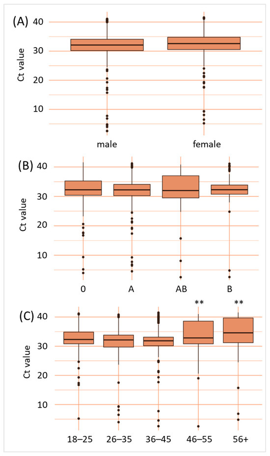 Furthermore, we analyzed the influence of sex, ABO blood group, and age on the B19V viral load of all donations within the years 2017–2024. Regarding sex, 53% of the B19V-positive donors were male, while 47% were female, indicating a higher rate of B19V-positive females than within the donor population investigated (Table 2). However, when comparing Ct-values of male and female B19V-positive donors, our data did not reveal any significant difference (p > 0.05) (Figure 4A). ABO blood groups were distributed similarly to the general population (Table 2). However, the rate of B19V-positive blood donations in blood group A was slightly higher than expected. Again, no significant differences between the Ct-values of different ABO blood groups were detected (p > 0.05) (Figure 4B). As far as age groups are concerned, we found substantially higher numbers of younger blood donors being B19V-positive (Table 2): About 25% of B19V-positive donors were aged 18–25, 20% were between 26 and 35, and 27% were in the age group 36–45. Furthermore, 19% of B19V-positives were aged 46–55, and 9% were in the age group 56+. Together, the age group 18–45 make up 54% of the total blood donations and account for 72% of all B19V-positive blood donations, while the age group 45+ account for 46% of all blood donations and 28% of B19V-positive blood donations. Furthermore, a comparison of the Ct-values revealed that older age groups (46–55 and 56+) show significantly higher Ct-values, when compared to younger age groups (p < 0.01) (Figure 4C).