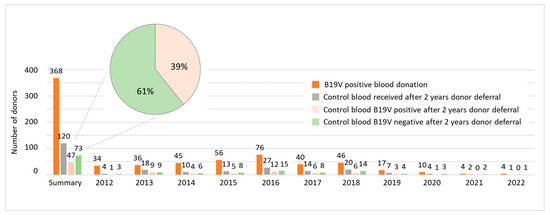 At the Department for Transfusion Medicine in Salzburg, B19V-positive blood donors are deferred for 2 years before they are allowed to donate blood again. As B19V deferral modalities can be an issue for blood banks due to the shortage of suitable blood donors, we asked whether a shorter deferral would be more reasonable. Thus, we analyzed 368 B19V-positive blood donors who were invited to provide a control blood sample by the end of 2024. In total, 120 people returned for a follow-up blood test after the end of the donor deferral. Of these, 47 tested positive for B19V again and 73 tested negative. These results indicate that, after two years, 39% of B19V-positive blood donors still were tested positive for B19V DNA (Figure 5).