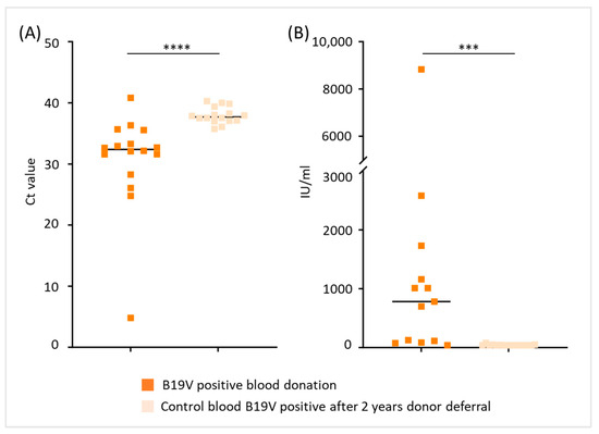 B19V load in blood donors tested positive again after a 2-year deferral period. (A) Ct values and (B) B19V titer values (IU/mL) of blood donors tested positive for B19V compared to Ct and titer values of their initial blood donation (*** p < 0.001, **** p < 0.0001). To obtain better descriptiveness of the figure shown in (B), data with >10,000 IU/mL of three individuals are not depicted in the plot.