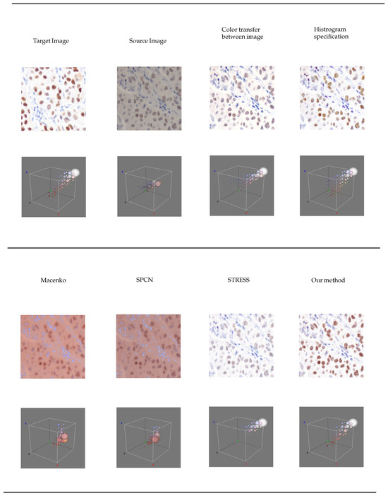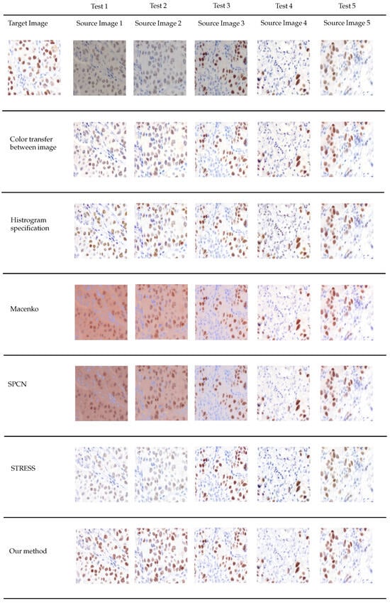 Most existing normalization methods primarily focus on hematoxylin and eosin (H&E) stained slides due to the greater availability of open datasets for H&E compared to immunohistochemistry (IHC) staining. H&E staining provides basic morphological information but lacks molecular details like antigen expression, which IHC staining offers. IHC staining is crucial for pathologists to predict cancer cell growth, and its evaluation involves counting different types of nuclear staining and cell populations. Given the large volume of slides pathologists process, automated image analysis systems were developed for biomarker scoring [11,12,13,14,15]. Unnormalized IHC images can lead to incorrect cell labeling, potentially resulting in inappropriate treatments and affecting cancer cell growth. Furthermore, empirical evidence demonstrated a statistically significant enhancement in diagnostic confidence upon applying medical image normalization [16].