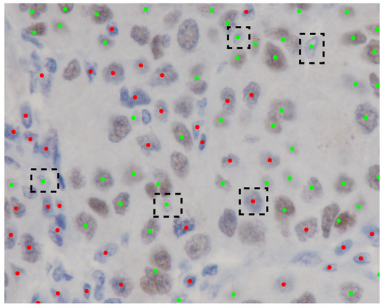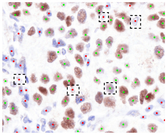 Figure 6. The categorization of nuclei within the normalized Source Image 2 utilizing the methodology we have proposed. Green dots denote immunopositive nuclei, whereas red dots signify immunonegative nuclei. The black dashed rectangles illustrate the instances of erroneous predictions made by our methodology.