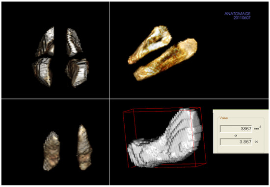 Three-dimensional CBCT image volume renderings and segmentations of the MS. The figure illustrates bilateral maxillary sinus boundaries delineated for volumetric analysis.