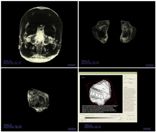 Axial images, exported in DICOM format, were imported into the InVivoDental 5.1.2® software (Anatomage Inc., San Jose, CA, USA) for analysis. For volume measurements of the nasal conchae (Figure 1) and maxillary sinuses (Figure 2), we adjusted the “Soft Tissue 1” visualization setting in the “Volume Render” tab. This involved fine-tuning the brightness and opacity to optimize the visibility of the soft tissue structures within the nasal cavity. Each nasal concha and sinus was clearly delineated using the software’s segmentation/cutting tool, adhering to anatomical boundaries to isolate the areas of interest. The “Volume Measurement” tool in the software was utilized to measure the volumetric data. Volume measurements of the maxillary sinus, inferior and middle nasal conchae, and 3D cephalometric analysis were conducted using the InVivoDental program.