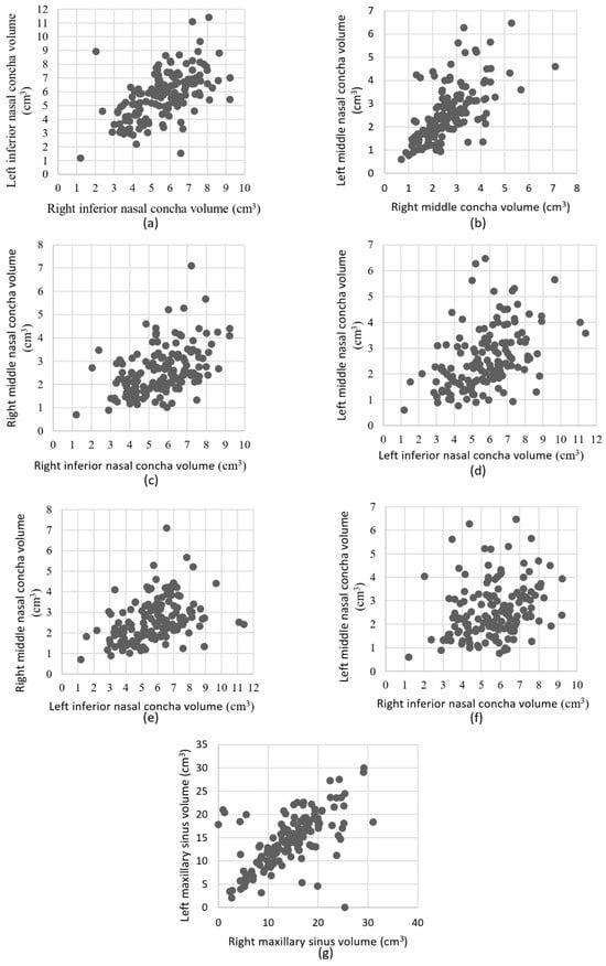 Scatter plots illustrating the correlations between bilateral and inter-structural volumetric measurements of nasal conchae and maxillary sinuses. (a) Left vs. right INC volumes (b) Left vs. right MNC volumes (c) Right INC vs. right MNC volumes (d) Left INC vs. left MNC volumes (e) Left INC vs. right MNC volumes (f) Right INC vs. left MNC volumes (g) Left vs. right maxillary sinus (MS) volumes.