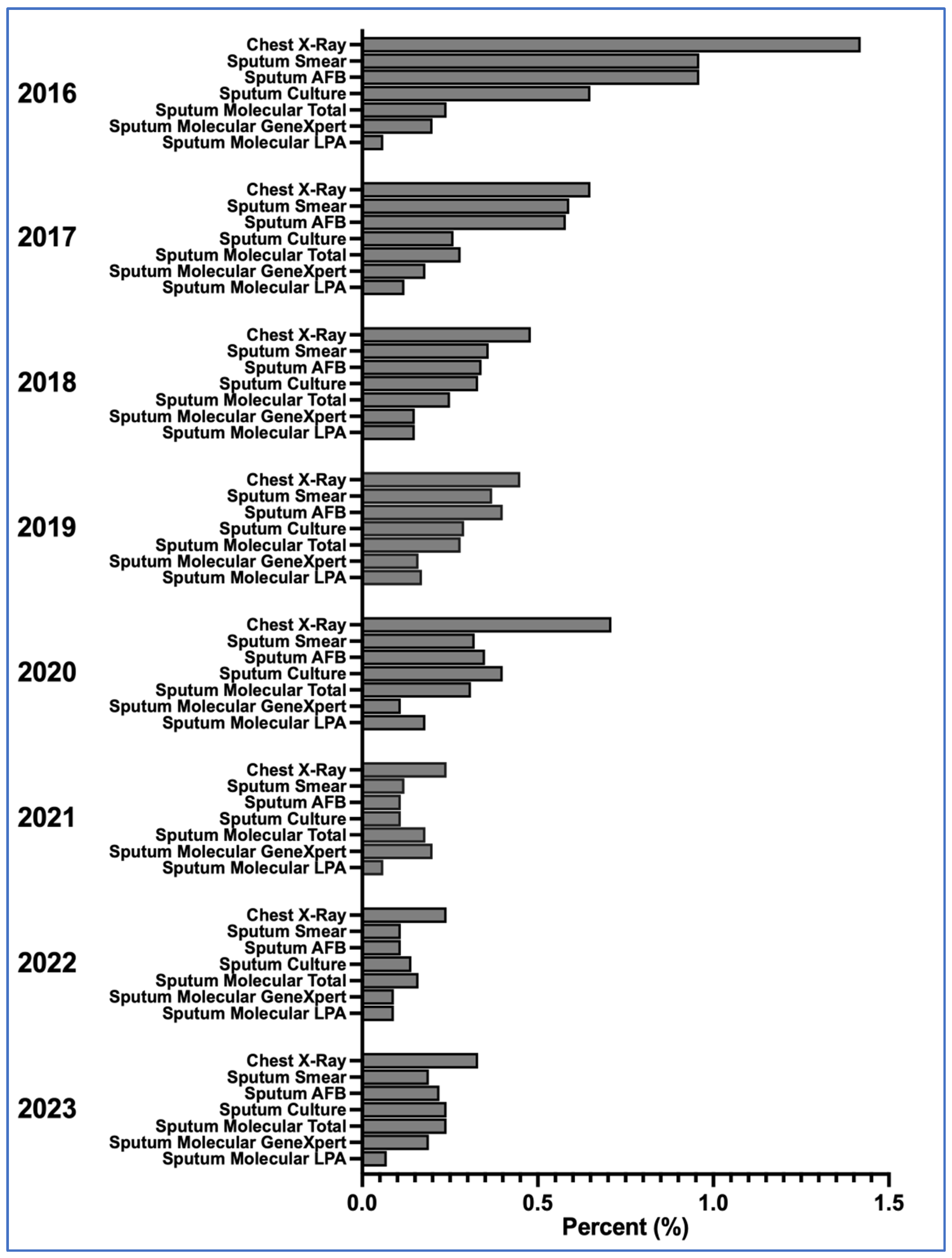 p = 0.456). Overall, these findings indicate declining reliance on CXR, smear microscopy, and AFB staining, while molecular diagnostics, though used at lower levels, maintained stable yields across the study period.