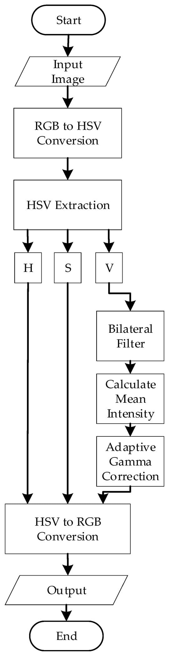 Next, adaptive gamma correction is applied. In this project, the gamma value (γ) was defined adaptively based on the mean intensity of the filtered V-channel. The adaptive gamma adjustment was designed to brighten darker images using a gamma value greater than 1 and reduce the brightness of overly bright images using a gamma value less than 1. The mathematical equations are represented by Equations (4) and (5). For darker images (Mean intensity > 0.5):