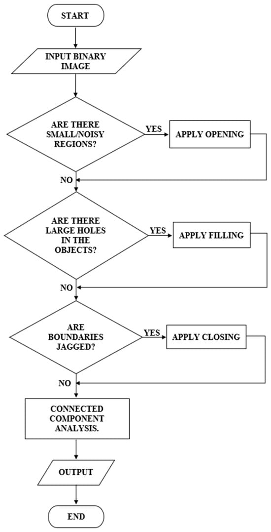 Figure 6 depicts a flowchart for post-processing in this algorithm. After the initial segmentation using multi-Otsu thresholding, the resulting binary image was subjected to connected component analysis to detect small noisy regions that were likely artifacts or irrelevant details.