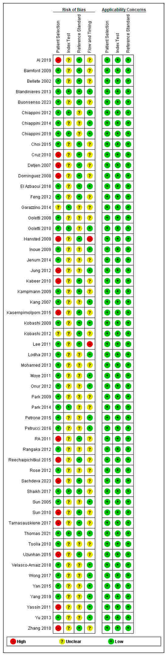 Application of the QUADAS-2 tool revealed that the majority of included studies exhibited low applicability concerns across three domains: participant selection, index test methodology, and reference standard criteria. In contrast, assessment of bias risk indicated that most studies demonstrated a low risk of bias in the patient selection domain, whereas the index test domain was characterized by an unclear risk of bias. A detailed breakdown of these judgments is provided in Figure 2.