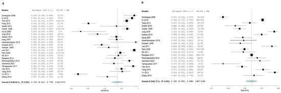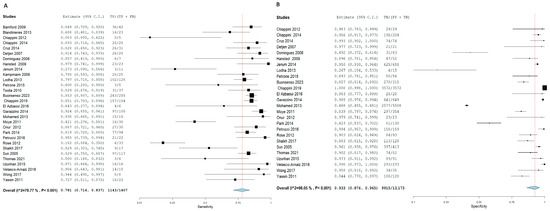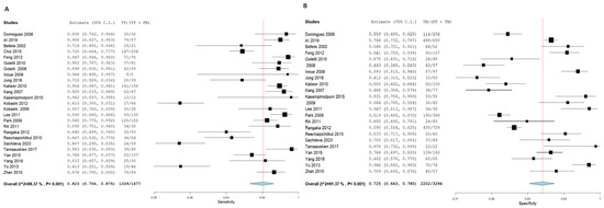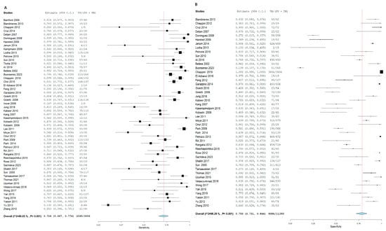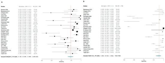 Forest plot of estimates of sensitivity and specificity: The red dotted line indicates the overall pooled estimate. The blue diamond represents the summary effect size with its 95% confidence interval. Each black square shows the effect estimate of an individual study, with the square size proportional to the study’s weight in the analysis. (A) Forest plot showing pooled sensitivity estimates with 95% confidence intervals for included studies. (B) Forest plot showing pooled specificity estimates with 95% confidence intervals for included studies.
