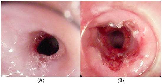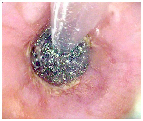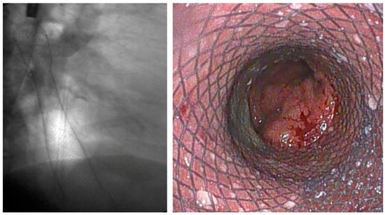 Another relevant complication of SEMS placement is tissue overgrowth, which occurs in approximately 15% to 20% of cases, particularly when the stent remains in place for more than one month [30]. Overgrowth can complicate stent removal and may result in mucosal damage. Mucosal erosion and bleeding, although less frequent, are reported in about 4.3% of patients and are more commonly observed in those undergoing neoadjuvant chemoradiotherapy, where the incidence may rise to 22.5% [31,32].