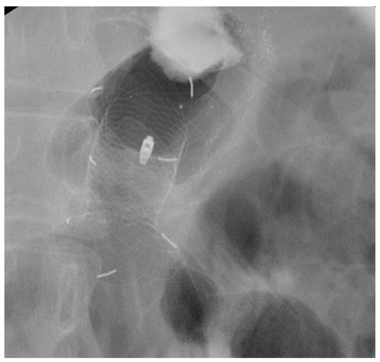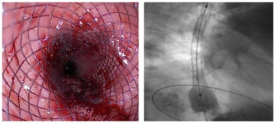- Fischer, A.; Bausch, D.; Richter-Schrag, H.-J. Use of a Specially Designed Partially Covered Self-Expandable Metal Stent (PSEMS) with a 40-Mm Diameter for the Treatment of Upper Gastrointestinal Suture or Staple Line Leaks in 11 Cases. Surg. Endosc. 2013, 27, 642–647. [Google Scholar] [CrossRef]