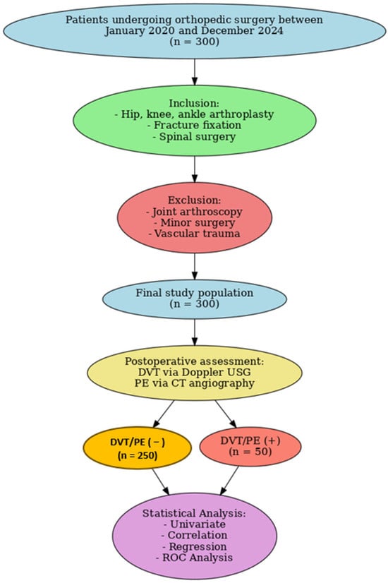 This study was conducted as a retrospective observational cohort analysis of patients who underwent orthopedic surgery at two tertiary care centers between January 2020 and December 2024. Eligible procedures included hip, knee, and ankle arthroplasties, fracture fixations, and spinal surgeries, while patients undergoing arthroscopies, minor interventions, or operations with open vascular injuries were excluded. Based on postoperative outcomes documented in hospital records, patients were stratified into two groups: those who developed thromboembolic complications (DVT/PE [+]) and those who did not (DVT/PE [−]). The diagnosis of DVT was confirmed by lower extremity venous Doppler ultrasonography, whereas PE was verified using thoracic CT angiography. All group allocations were determined retrospectively from clinical and imaging data.