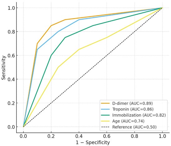 p = 0.009). D-dimer levels above 0.9 mg/L showed the strongest discriminative power, with an AUC of 0.89 (95% CI: 0.82–0.94), 88% sensitivity, and 84% specificity (