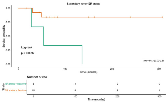 Further analysis was based on the evaluation of the role of all recorded characteristics in patient survival. The results are depicted in Table 5. Notably, a negative ER on a secondary tumor was found to be linked to worse patient survival (HR: 0.13, 95% CI: 0.02–0.8, p = 0.01); see Figure 2.