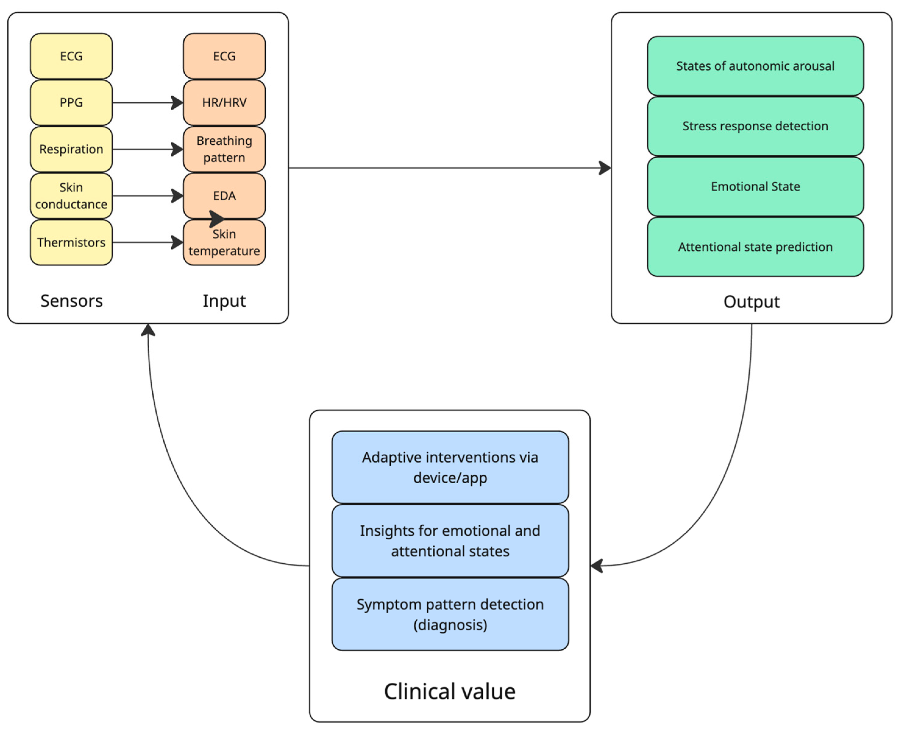 Autonomic arousal | Andrikopoulos D et al., 2024 [28] | ML detection of adult ADHD from multimodal wearable signals during Stroop tasks | Adults; ADHD/controls: 32/44 (N = 76) | Case–control ML classification (LR/KNN/RF/SVM); internal cross-validation; i-KNN filtering, data collected during Stroop tests | Feel Monitoring Device + app (Feel Therapeutics)—EDA, PPG HR/HRV, skin temperature (9-axis IMU present; not modeled). | SVM (multimodal): accuracy 0.816; sensitivity 0.814; specificity 0.819. Unimodal models lower/less balanced |