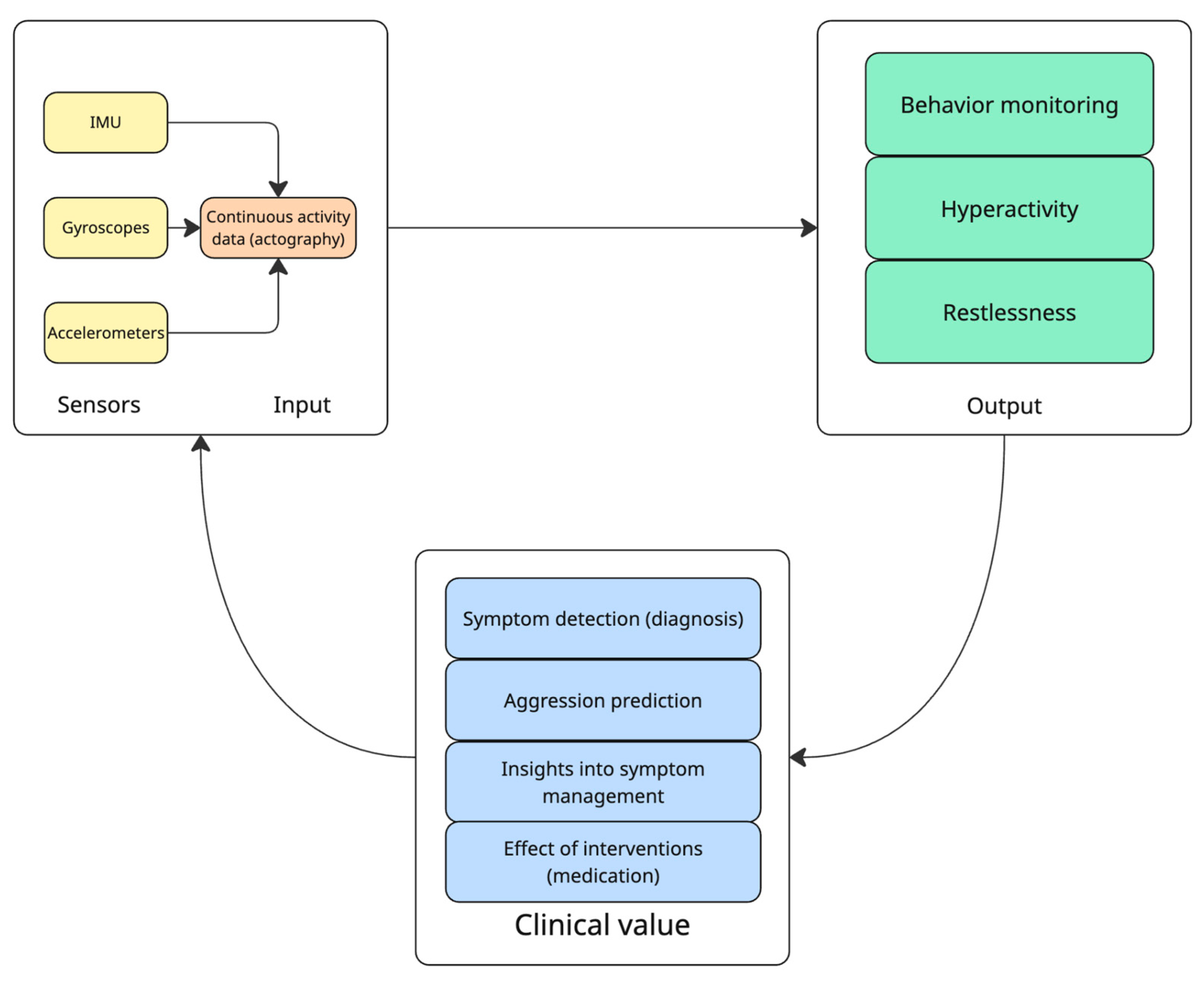 Aggression/ agitation | Park C et al., 2023 [11] | ML detection of aggression episodes from waist-worn actigraphy in children with/without ADHD | N = 39; ages 7–16; repeated 1-week wear (3 times/12 months) | Observational monitoring; parent episode logs as labels; Random Forest model; internal validation | ActiGraph GT3X+ (ActiGraph Corp.)—triaxial accelerometer (waist) | AUC 0.893; accuracy 0.820; recall 0.850; precision 0.802; F1 0.824. Vector-magnitude acceleration higher during aggression vs. non-aggression (means 1580.7 ± 1831.1 vs. 873.3 ± 1137.2; approx. Cohen’s d ≈ 0.46, epoch-level; p = 0.027) |