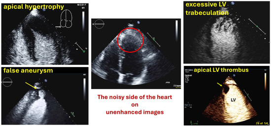 Most LV thrombi are attached to the LV apex and associated with apical STEMI, Takotsubo cardiomyopathy, dilated cardiomyopathy, aneurysms or endomyocardial fibrosis. Usually, LV thrombi are attached to severely hypokinetic/akinetic apical myocardium [7,8]. Thrombi attached to basal and mid-LV segments are less frequent but may be found attached to akinetic/dyskinetic wall segments. Thrombi along the mid/basal segments often can be displayed without UEAs. The focus should be moved to the depth of the akinetic/dyskinetic segments. The echogenicity of fresh thrombi can be very low, which limits the detection on recordings without UEAs. As thrombi have very few vascular components following UEA, they will appear as dark masses in the opacified LV. Tumors are vascularized and are opacified [9,10,11].