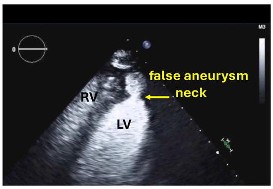 Apical false aneurysm—note the narrow neck compared to the diameter of the aneurysm, RV right ventricle, LV left ventricle.