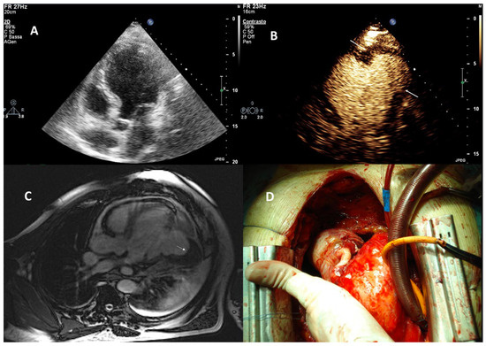 Large true aneurysm. Standard transthoracic echocardiography does not clearly visualize the post-MI lateral aneurysm (apical 4-chamber view) (A). After an intravenous bolus of UEA, CEUS reveals a massive lateral aneurysm (arrows) with suspect mural thrombus (apical 4-chamber view) (B). Cardiac magnetic resonance confirms the presence of the aneurysm and thrombus (arrow) (C). Intraoperative view of the aneurysm and thrombus (D).