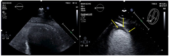 - Abdelmoneim, S.S.; Pellikka, P.A.; Mulvagh, S.L. Contrast echocardiography for assessment of left ventricular thrombi. J. Ultrasound Med. 2014, 33, 1337–1344. [Google Scholar] [CrossRef]